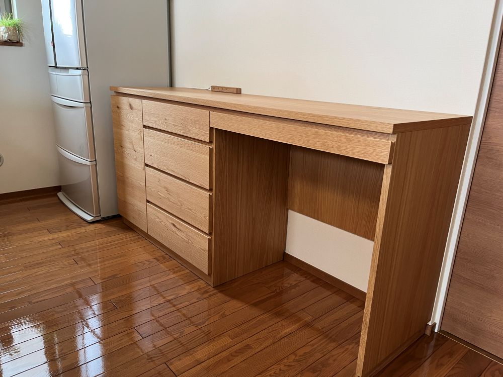 こんなカウンター収納が欲しいんですけど、出来ますか? そんなお問い合わせから始まり、図で簡単にスケッチをして イメージを作り、図面に仕上げて細かい寸法を決めて 使用する材料、仕上げを見本板でやり取りさせていただきました。 オーク材 天板と前板ムク 引出の前板を枠組みで真鍮の把手 と...