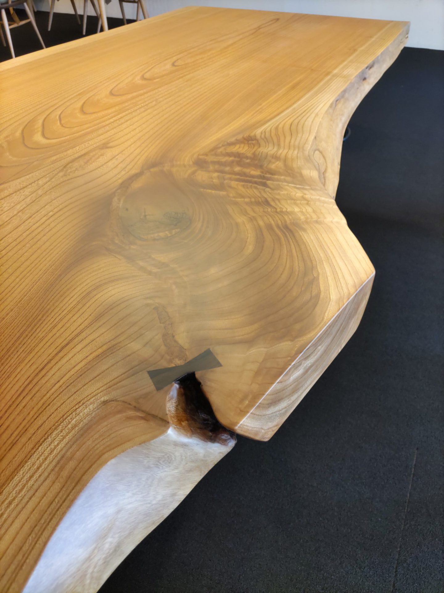 あえて割れ部分をそのまま残し、契りを入れた特徴ある一枚板です。